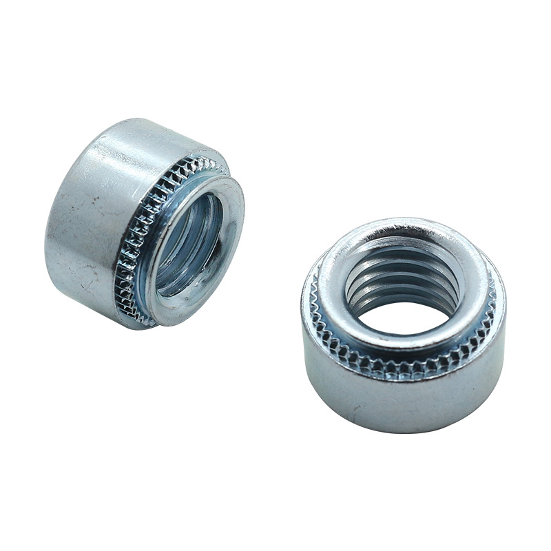 Ang carbon steel round self clinching nuts ay kadalasang gawa sa mataas na lakas ng carbon steel (karaniwang grade 8.8 o mas mataas), hindi kinakalawang na asero tulad ng mga uri ng austenitic (A2/304, A4/316), o mga haluang metal na aluminyo (tulad ng 5056 o 7075).