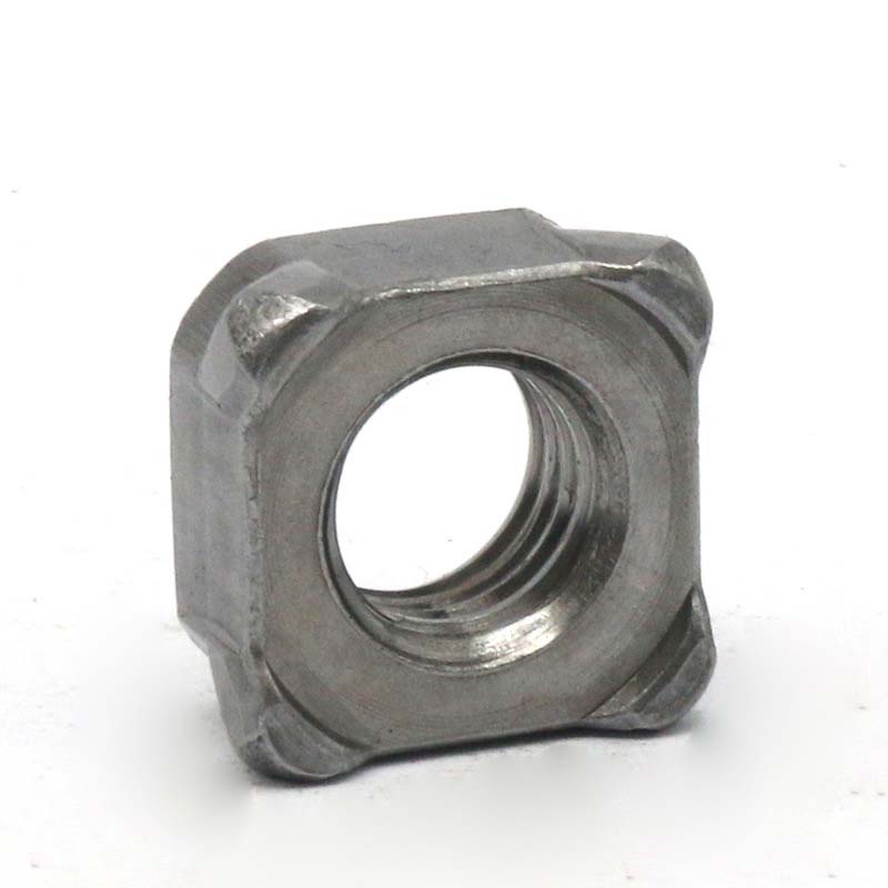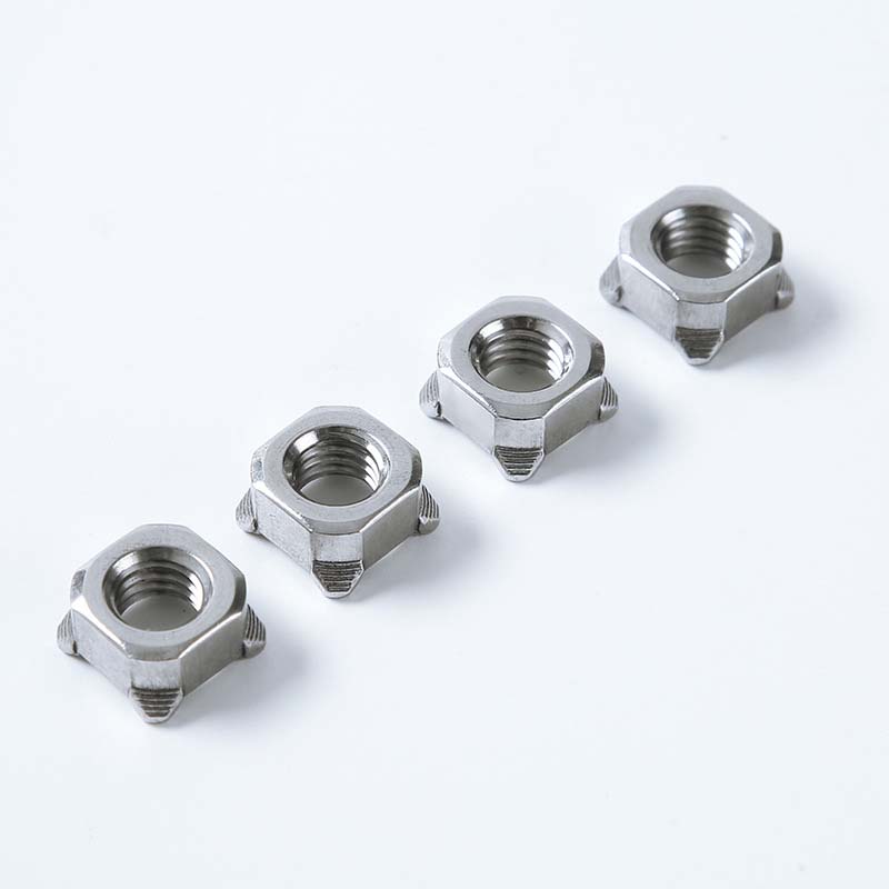 Ang Class 5 weld square nuts ng type 1d ay walang isang anggular na disenyo ng butas. Sa halip, ang isang maliit at nakataas na protrusion ay idinisenyo sa ilalim. Ang mga ito ay partikular na idinisenyo para sa paglaban sa lugar ng paglaban. Ang mga electrodes ay pinipilit pababa, at ang kasalukuyang dumadaloy sa nakataas na lugar. Ang nakataas na lugar ay agad na natutunaw at nag -fuse ng nut na may pinagbabatayan na metal.