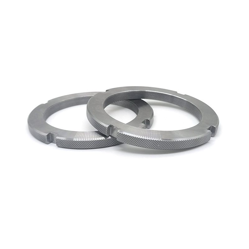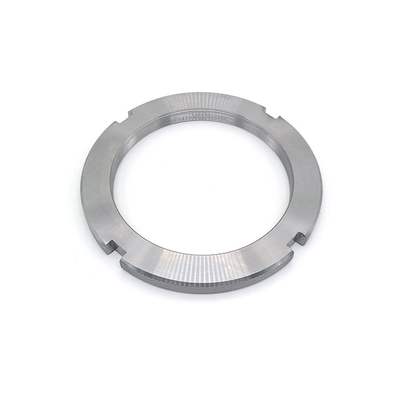 Ganap na sinulid na slotted round nuts - tinukoy ang mga ito ayon sa mga pamantayan tulad ng DIN 546 at pangunahing ginagamit upang makamit ang isang ligtas na koneksyon sa pangkabit at maaaring makatiis ng mga panginginig ng boses. Ang pangunahing tampok ng mga mani na ito ay namamalagi sa mga puwang na pinutol sa isang dulo ng nut. Narito kung paano gamitin ang mga ito: Una, i-screw ang nut papunta sa isang pre-drilled bolt o stud at higpitan ito sa nais na posisyon. Pagkatapos ng paghigpit, ihanay ang puwang na may butas sa bolt shaft. Sa wakas, ipasok ang isang bukas na pin (locking washer) o linya ng kaligtasan sa pamamagitan ng nakahanay na puwang at butas ng bolt, at pagkatapos ay yumuko ang mga dulo ng pin upang matiyak ang isang ligtas na akma. Kaya, sa pagkakaroon ng mga panginginig ng boses, ang nut ay hindi maluwag.