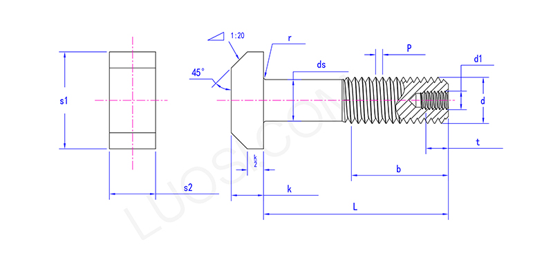Ang ulo ng nabawasan na shank T bolt na may butas ay katulad ng isang rhombus at maaaring ma-stuck sa T-slot na maayos at hindi paikutin. Ang gitnang bahagi ng tornilyo nito ay naging mas payat, iyon ay, ang "shrunken rod", at isang butas ay na -drill din sa ilalim ng tornilyo. Ang interior ay guwang.