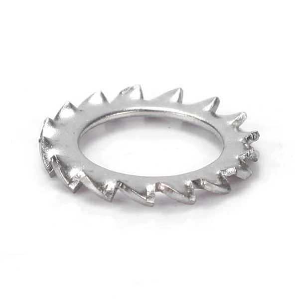 Ang mga serrated lock washers na panlabas na ngipin ay isang uri ng washer na karaniwang ginagamit para sa koneksyon ng mga mekanikal na bahagi, at ang pangunahing tungkulin nito ay upang makamit ang isang mahigpit na koneksyon sa pagitan ng mga bahagi sa pamamagitan ng pag-lock. Ang mga panlabas na lock washer ng ngipin ay karaniwang gawa sa mga materyales na may mataas na lakas, tulad ng hindi kinakalawang na asero, aluminyo na haluang metal o tansong haluang metal, na may mahusay na mga katangian ng mekanikal at lumalaban sa kaagnasan. Ang prinsipyo ng panlabas na tooth lock washer ay ang paggamit ng espesyal na geometry nito upang makamit ang pag-lock.